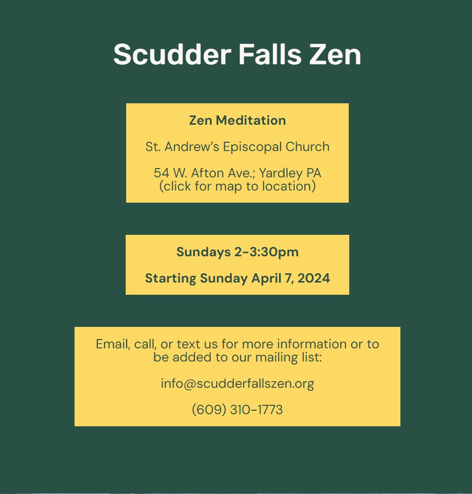 We all experience suffering, stress, and distraction, but Zen offers us a path to end them. Zen is a combination of proven contemplative practices including seated meditation and mindfulness meditation, and if practiced regularly reduces stress, improves focus, and enhances overall well-being. Scudder Falls Zen is a local community meditation group that offers a welcoming and supportive environment for people of all experience levels to learn and practice Zen meditation. Everyone is welcome, from the Zen curious to the Zen master.